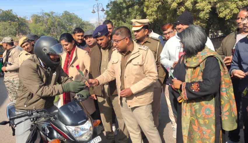 जिला कलेक्टर और पुलिस अधीक्षक ने दिखाई हरी झंडी, हेलमेट लगाने वाले चालकों को दिए गुलाब