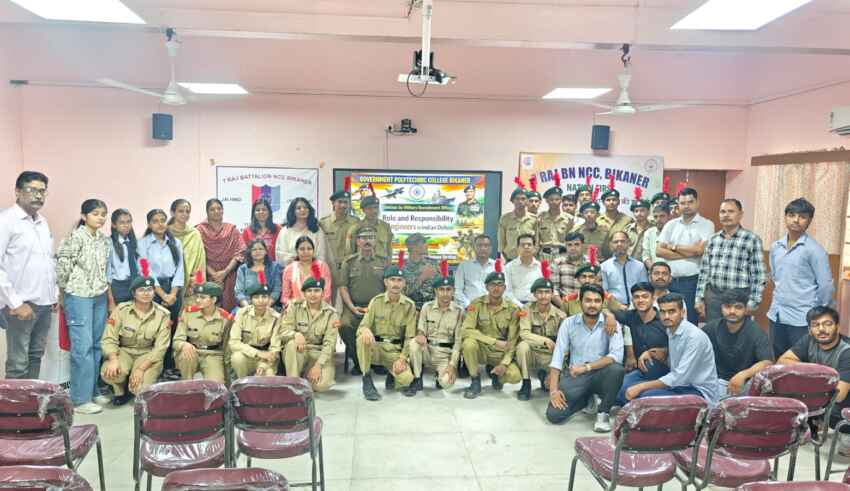 दिनांक : 28.03.2026 | बीकानेरराजकीय पॉलिटेक्निक महाविद्यालय, बीकानेर में एनसीसी इकाई के तत्वावधान में “भारतीय सेना में इंजीनियर की भूमिका” विषय पर विशेष व्याख्यान आयोजित किया गया। कार्यक्रम की शुरुवात माँ सरस्वती के चित्र पर दीपप्रज्ज्वल व पुष्पांजलि तथा सामूहिक रूप से राष्ट्रगीत वन्देमातरम का गायन के साथ हुई। एनसीसी प्रभारी मेजर एस. एल. राठी ने बताया कि इस व्याख्यान में मुख्य वक्ता मेजर एस. संग्राम, भर्ती चिकित्सा अधिकारी, सेना भर्ती कार्यालय (एआरओ), झुंझुनू थे जिनका प्राचार्य श्री के के सुथार ने माला पहनाकर व पौधा भेंट कर स्वागत किया।